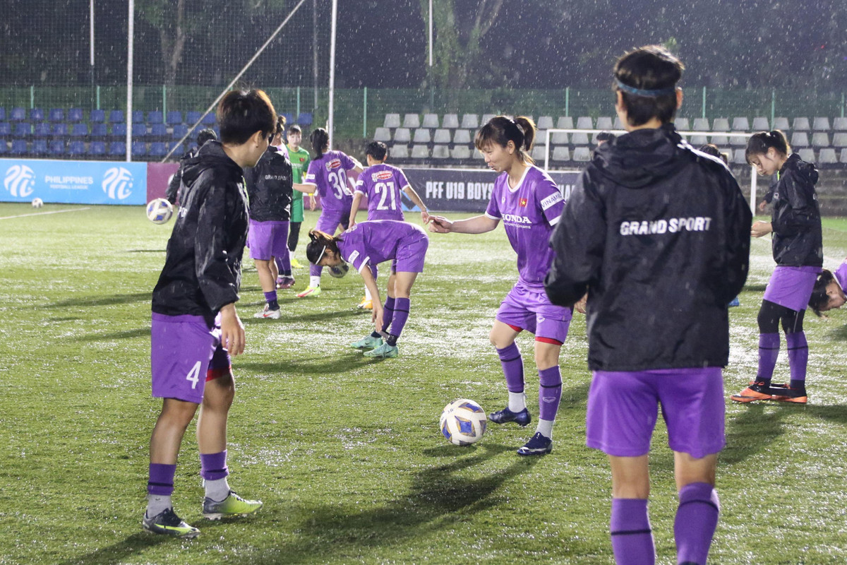 ĐT nữ Việt Nam bước vào buổi tập đầu tiên trên sân Trung tâm đào tạo bóng đá quốc gia (PFF National Training Centre) - cách khách sạn lưu trú của đội khoảng 30 phút di chuyển bằng xe bus.