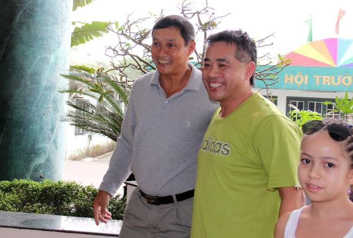 | Ông Nguyễn Thích cùng con gái và HLV Mai Đức Chung có mặt tại khách sạn La Thành (Ảnh: Hà Thành) |