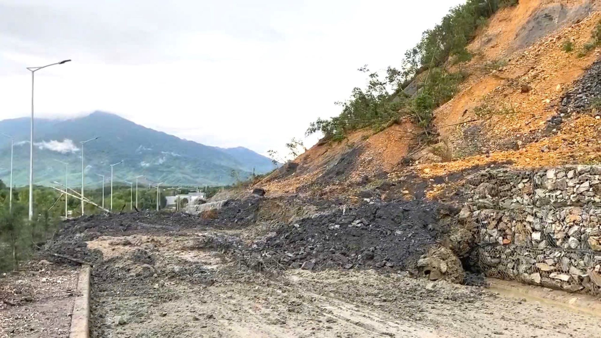 Tại hiện trường, điểm sạt lở taluy dương kéo dài gần 100m khiến bùn, đất đá theo mưa lớn vùi lấp hệ thống mương nước, tràn lấp một làn đường bên phải tuyến khiến giao thông ách tắc.