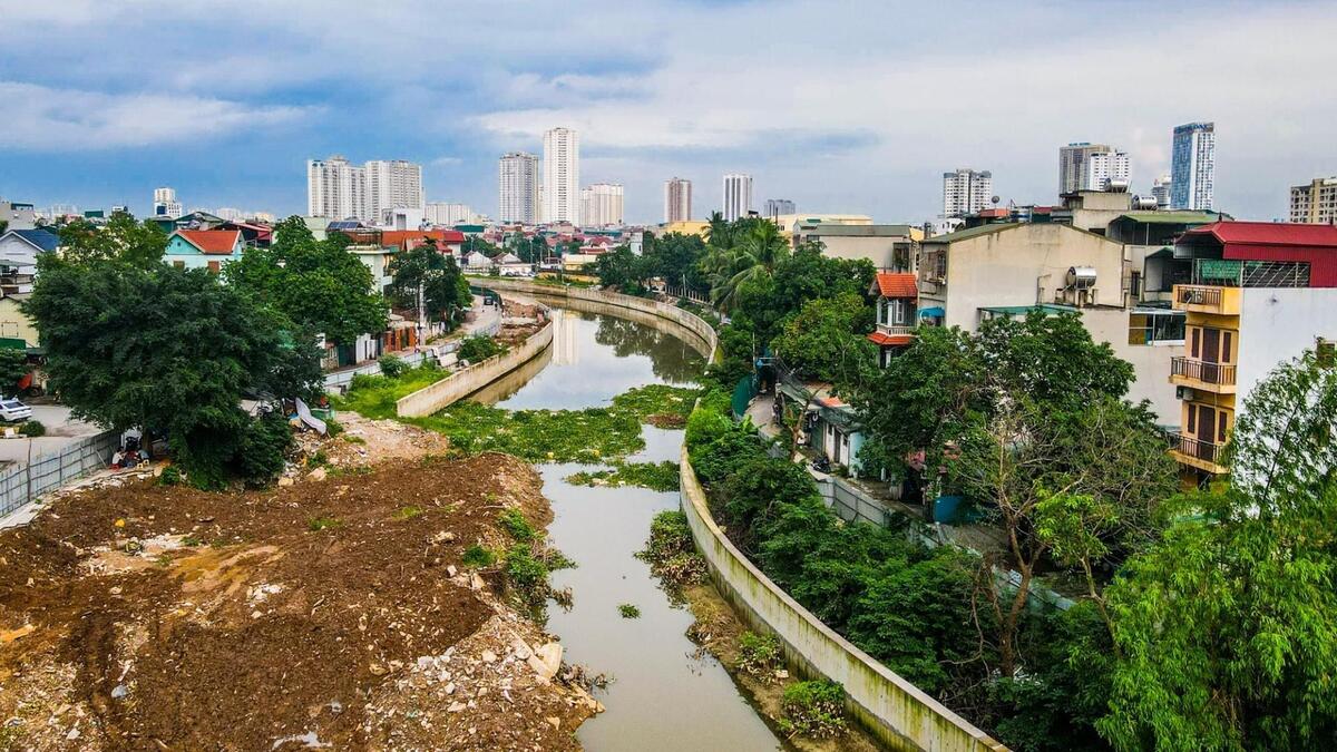 Ghi nhận của PV trong ngày 31/5, đoạn kênh qua phường La Khê (quận Hà Đông) đang ngổn ngang vật liệu, nhiều đoạn quây tôn kín nhưng chưa thi công, có đoạn lòng sông chỉ rộng vài mét bởi đất đá chất đống trong quá trình xây dựng san lấp.