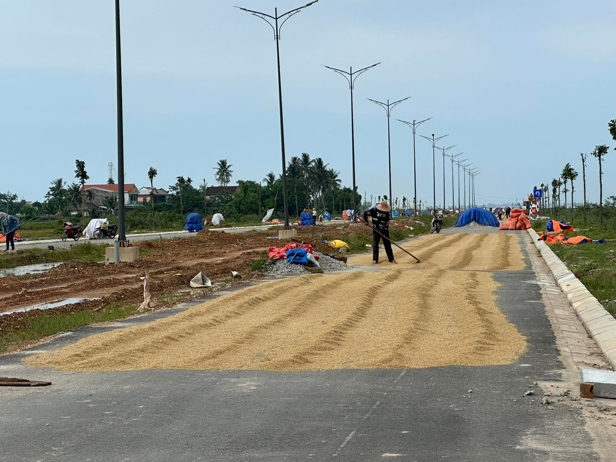 Bên trong công trường, những đoạn đã được rải thảm thì bị người dân sử dụng làm chỗ phơi thóc.