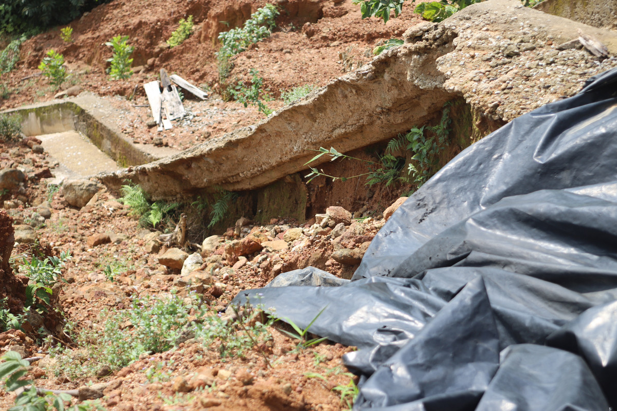Phần đất sau những trận mưa lũ liên tiếp hiện "no nước" có thể sạt xuống bất cứ lúc nào.