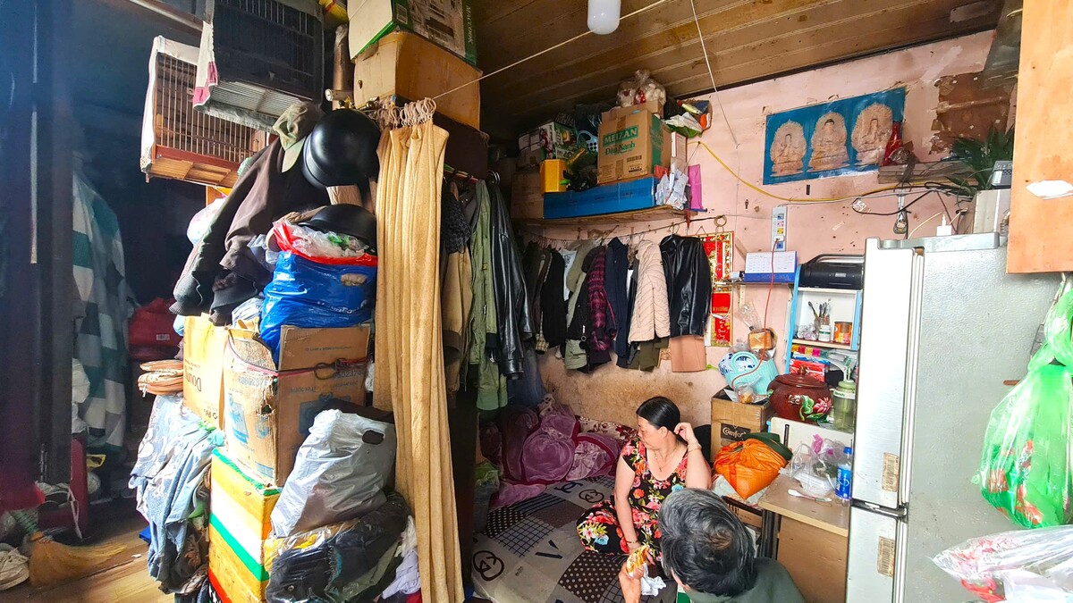 Trong không gian chừng 18m2, 5 người trong gia đình bà Nguyễn Phạm Mỹ Ngọc (46 tuổi) phải chen chúc trong không gian chật hẹp. Bà cho biết, rất mệt mỏi vì phải sống trong điều kiện cơ cực như khu ổ chuột ngay giữa trung tâm Đà Lạt.
