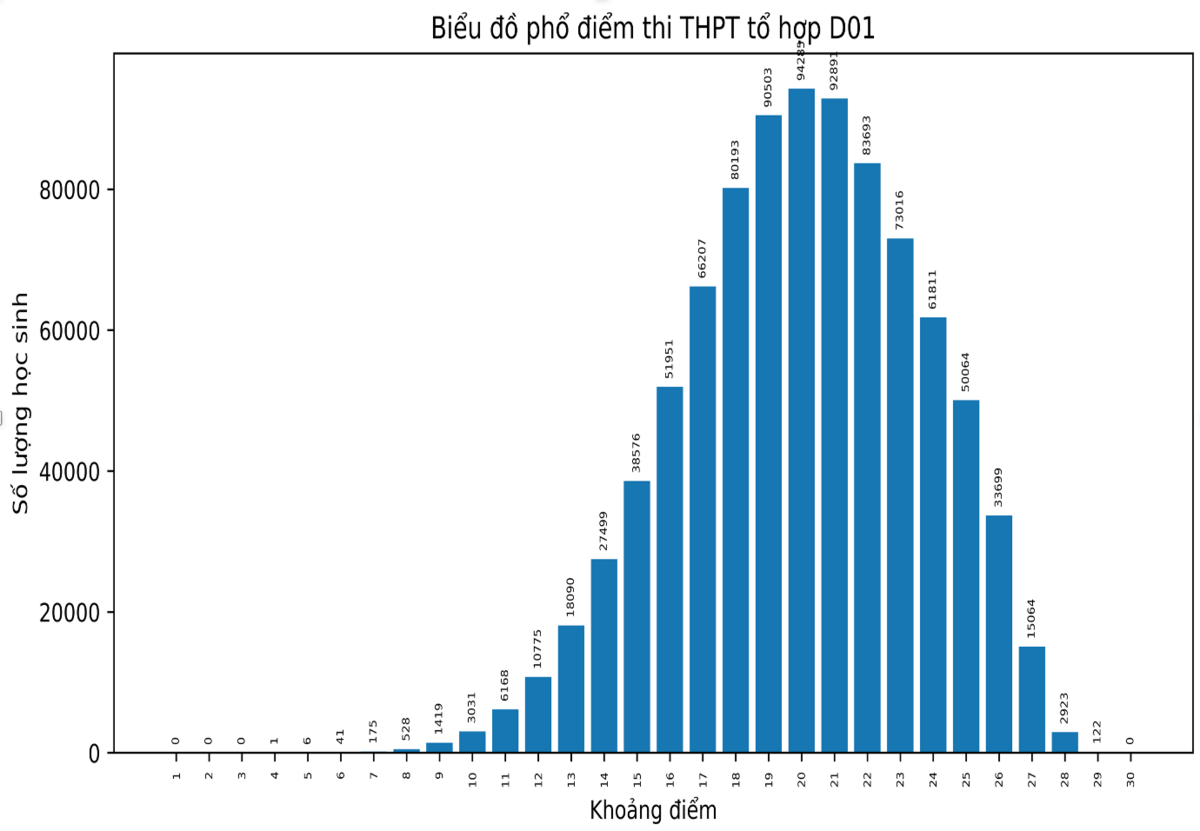 Tổ hợp D01 từ 24,5 trở lên có số thí sinh cao hơn năm 2023 khoảng 30 - 50% (do ảnh hưởng từ phổ điểm môn văn chót vót, dù môn tiếng Anh không cao). Vì thế các ngành lấy tổ hợp D01 năm trước có điểm từ 22-24 sẽ tăng khoảng 0,25 điểm. Các ngành năm trước có điểm từ 24 sẽ tăng khoảng 0,5 điểm.