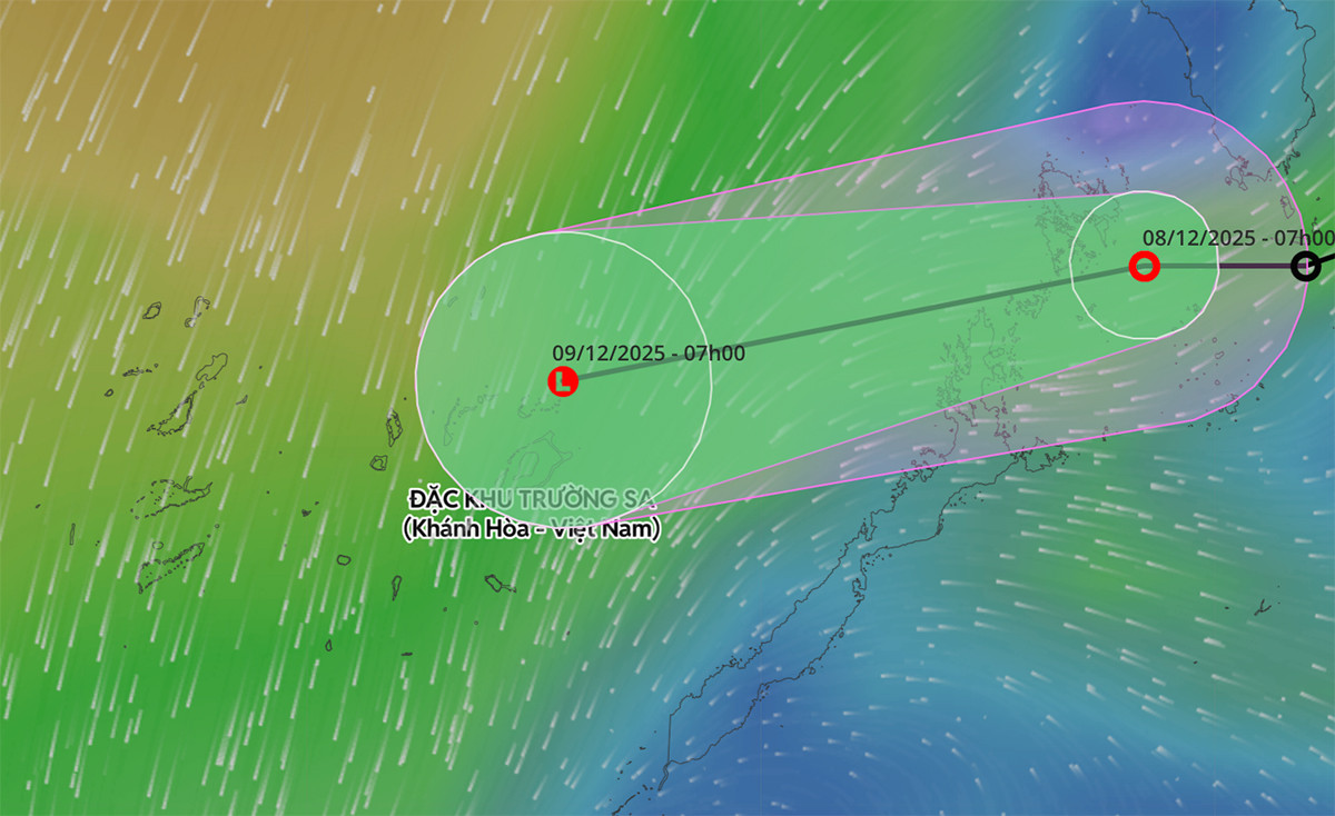 Ngoài ra, trong ngày và đêm 8/12, vùng biển phía Đông Nam khu vực giữa Biển Đông và khu vực Nam Biển Đông (bao gồm đặc khu Trường Sa) có mưa rào và dông rải rác. Trong mưa dông khả năng xảy ra lốc xoáy và gió giật mạnh cấp 6-7.