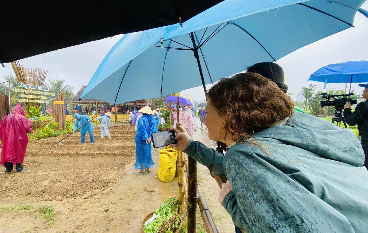 Hình ảnh nông dân Trà Quế tranh tài xới đất trồng rau được nữ du khách nước ngoài thích thú ghi lại.