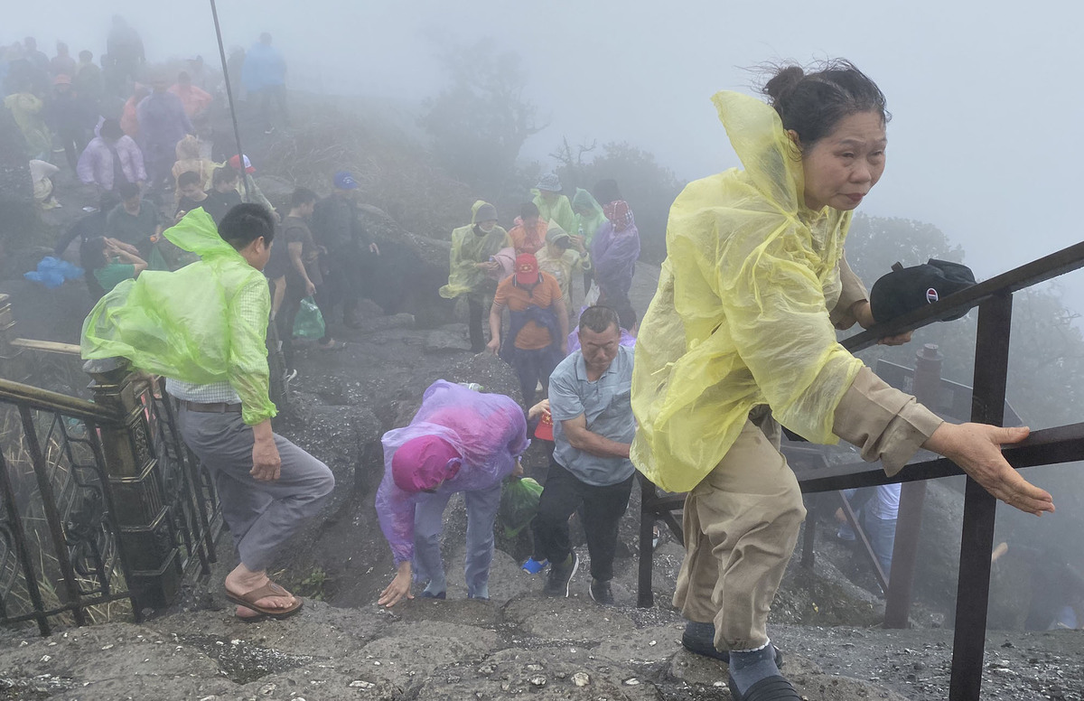 Sau khi đi cáp treo, nhiều du khách phải mặc áo mưa, bám chặt lan can, thận trọng từng bước tiếp tục chặng đường leo hơn 1km lên chùa Đồng. Bên cạnh đó, một số du khách vẫn lựa chọn leo bộ chặng đường 6km từ chân núi lên đình thiêng chiêm bái Phật hoàng Trần Nhân Tông.