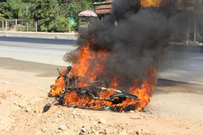 Vụ việc xảy ra vào khoảng 15h ngày 26/5, trên tuyến QL1, đoạn thuộc địa phận xã Lộc Thủy, huyện Phú Lộc (Thừa Thiên – Huế). Tại thời điểm PV có mặt, chiếc xe máy đã bốc cháy ngùn ngụt và gần như bị thiêu rụi gần như hoàn toàn.