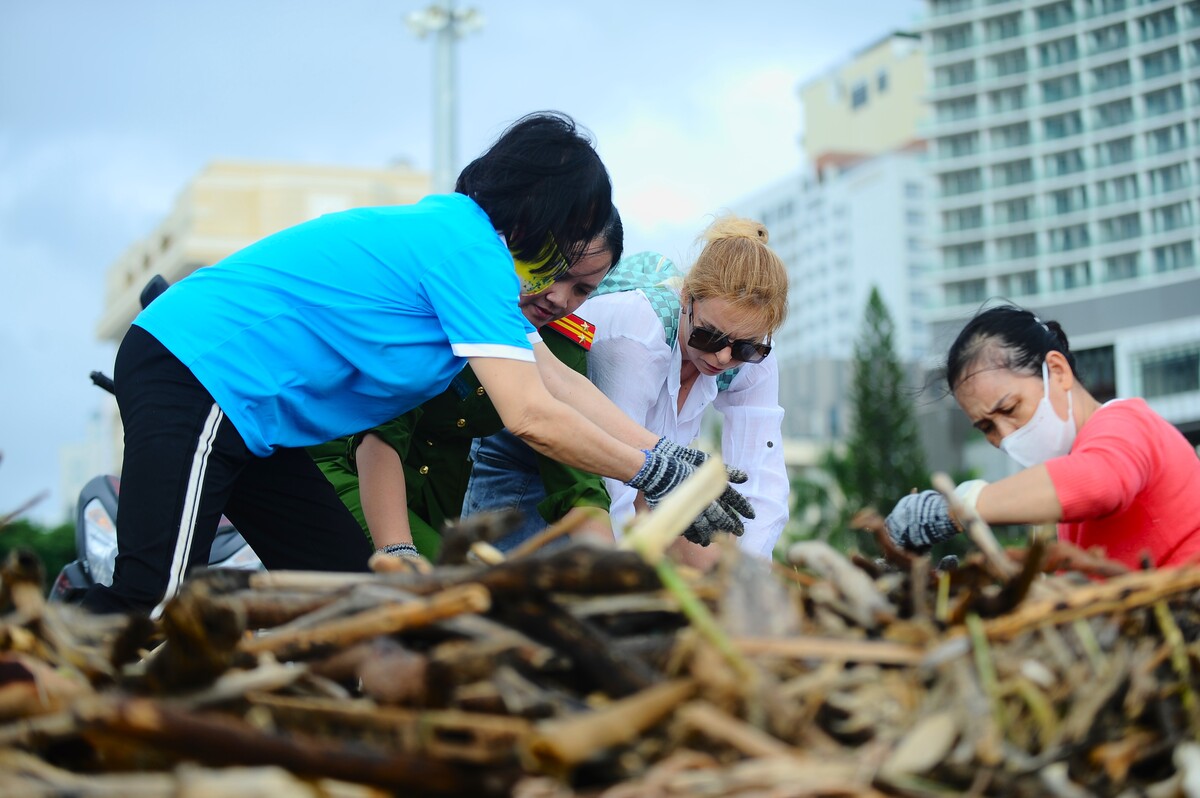 Lực lượng công nhân môi trường đến từ TP.HCM cũng có mặt để phụ giúp người dân Nha Trang dọn dẹp bãi biển.