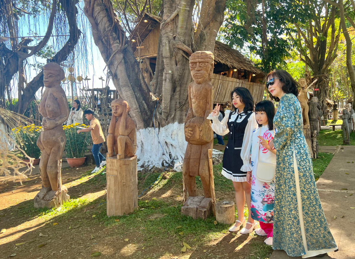Du khách chụp hình lưu niệm cùng các tượng gỗ điêu khắc.