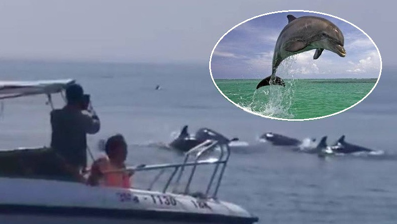 Sự hiện diện đường đột của đàn cá heo khiến lộ trình ra đảo của hàng chục du khách bị tạm hoãn trong mươi phút đồng hồ.
