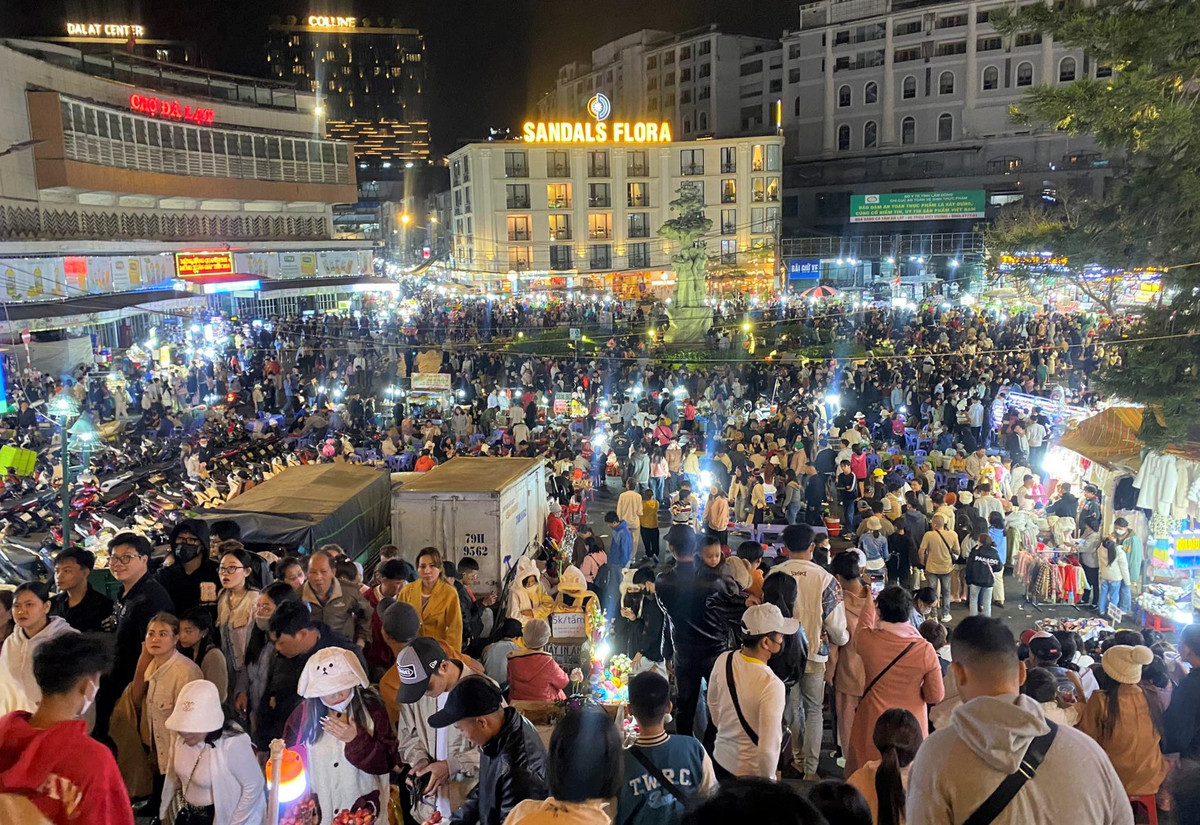 19h ngày 13/2 (mùng 4 Tết), hàng nghìn du khách và người dân địa phương đổ về tham quan, mua sắm, ăn uống tại chợ đêm Đà Lạt.