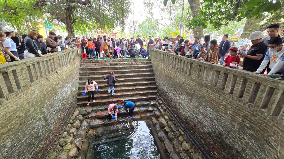 Nhiều du khách mang theo bình đựng để xin nước giếng mang về với mong ước rước may mắn, tài lộc, sức khỏe cho gia đình.