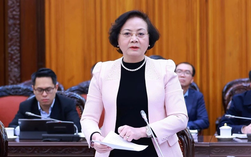 Bộ trưởng Bộ Nội vụ Phạm Thị Thanh Trà báo cáo tiến độ thực hiện sắp xếp, tinh gọn bộ máy của Chính phủ. (Ảnh: Dương Giang/TTXVN)