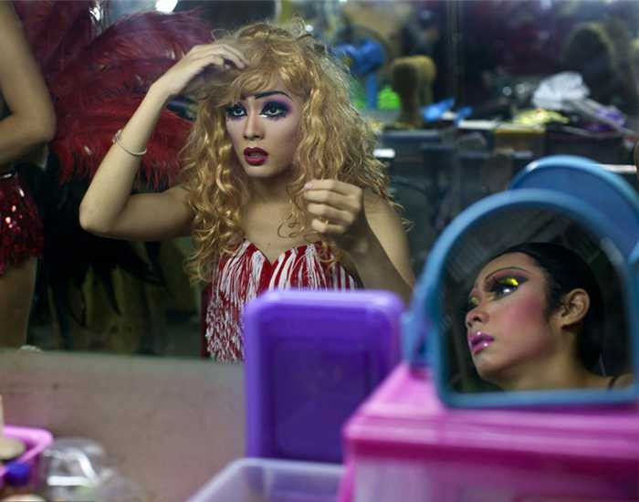 Vũ công chuyển giới Ashi đang ngắm lại mình trong gương. Không giống nhiều vũ công chuyển giới khác, Ashi vẫn giữ phần ngực như một người đàn ông.