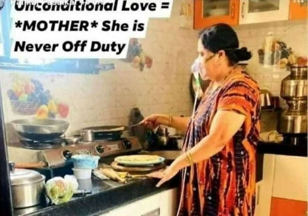 Mới đây, bức ảnh chụp một phụ nữ Ấn Độ mang mặt nạ dưỡng khí nhưng vẫn đứng trong bếp nấu ăn được lan truyền trên mạng kèm theo dòng chữ: Tình yêu vô điều kiện. Mẹ, người phụ nữ không bao giờ buông bỏ nghĩa vụ".