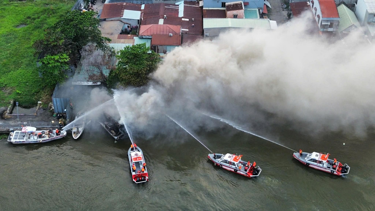 Tại hiện trường, nhiều cano chữa cháy được điều động để khống chế vụ hỏa hoạn.