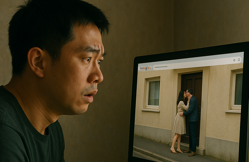 Góc chụp khiến tôi không nhìn rõ mặt người đàn ông kia. Anh ta mặc sơ mi, quần tây, phong cách công sở gọn gàng. Tay anh ta đưa mũ bảo hiểm cho vợ tôi, và nhận nụ hôn má của cô ấy. Khoảnh khắc mà chiếc xe Google Street View vô tình ghi lại là bằng chứng cho sự phản bội mà tôi chưa từng ngờ tới.