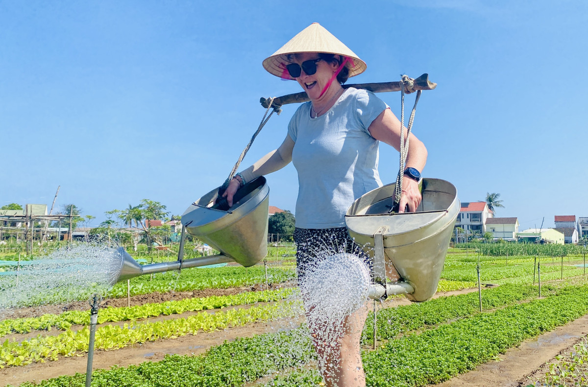 Đang hào hứng gánh nước tưới đều luống rau mới vun trồng, Siobhan - nữ du khách đến từ Australia - vui vẻ cho hay, thông qua kênh thông tin đại chúng, vợ chồng bà biết được làng rau Trà Quế vừa được công nhận là làng du lịch tốt nhất thế giới. "Ngay khi sang Việt Nam, địa điểm đầu tiên tôi và chồng muốn đến tham quan là làng rau Trà Quế. Thật thú vị khi được hóa thân thành nông dân để thực hiện các công đoạn của việc trồng rau. Đây chắc chắn là kỷ niệm không thể nào quên" - bà Siobhan bộc bạch.