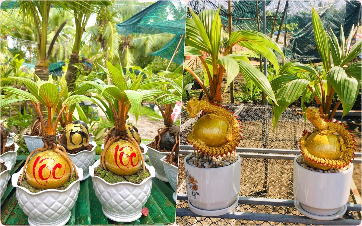 “Một trái dừa rồng Giáp Thìn 2024 được trang trí cầu kỳ nhất, đẹp mắt nhất tại cơ sở của tôi có giá 500.000 đồng”. Đó là trái dừa mầm chồi chắc khỏe, gốc to, bộ lá nhỏ với tán tròn, rễ chắc khỏe và phải đủ dài để nhô lên khỏi mặt chậu. Sọ dừa được sơn màu vàng, kết hợp với mô hình rồng nhỏ uốn quanh sọ dừa vô cùng sống động.