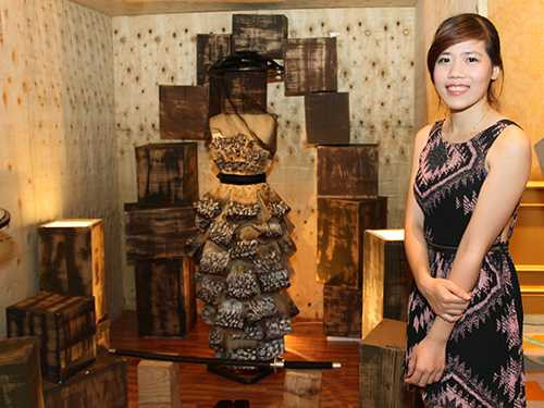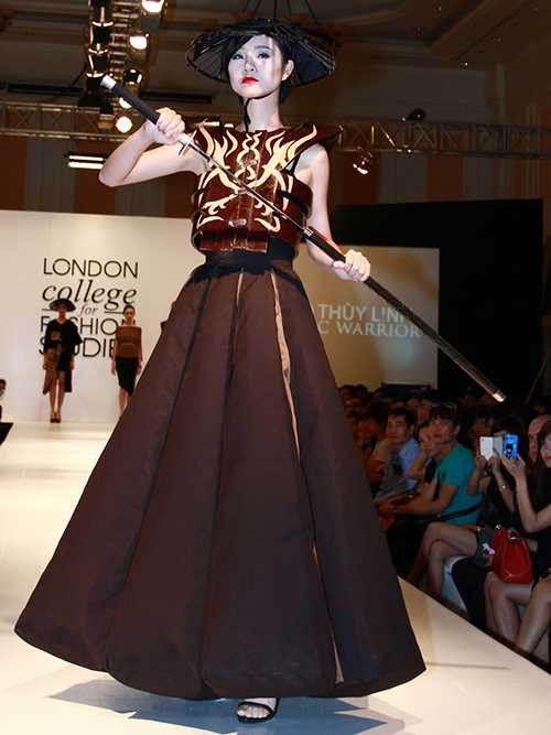 Trong số 5 mẫu thiết kế của bộ sưu tập “Chiến binh Samurai” của Thùy Linh, điểm nhấn là mẫu thiết kế mà áo làm bằng gỗ thật nặng gần 4kg và chân váy nặng hơn 10kg. “Trang phục của chiến binh Samurai gồm nhiều nét vừa vững vàng, vừa uyển chuyển. Trong đó, giáp phục bên ngoài được kết từ nhiều miếng gỗ nhỏ dùng dây để xâu chuỗi. Còn chiếc áo gỗ của tôi ghép những thanh gỗ nguyên khối bằng keo dính. Trong đó, có những thanh gỗ uốn cong ôm sát hai bên sườn tạo sự mềm mại”. Chiếc áo gỗ được kết từ 12 miếng gỗ và chia làm hai nửa thân, ghép với nhau bằng “khuy” sắt.