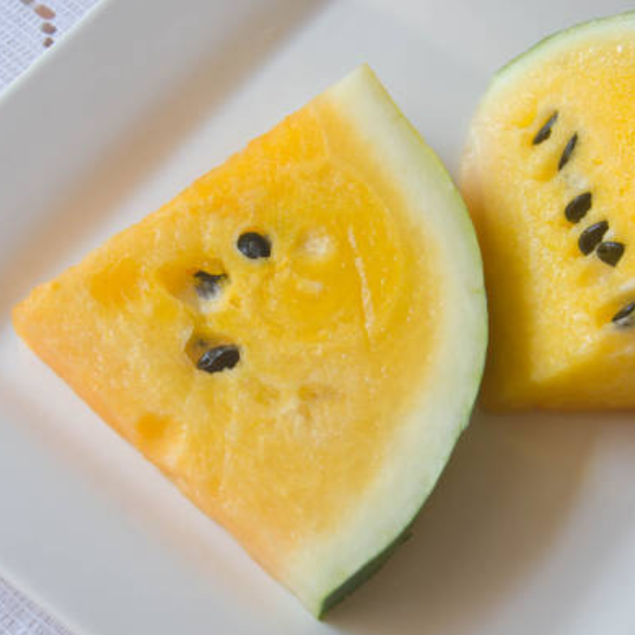 Dưa hấu ruột vàng có nguồn gốc từ châu Phi, vỏ mỏng hơn so với nhiều loại dưa hấu truyền thống, ruột vàng ươm, vị ngọt đậm, ít hạt.