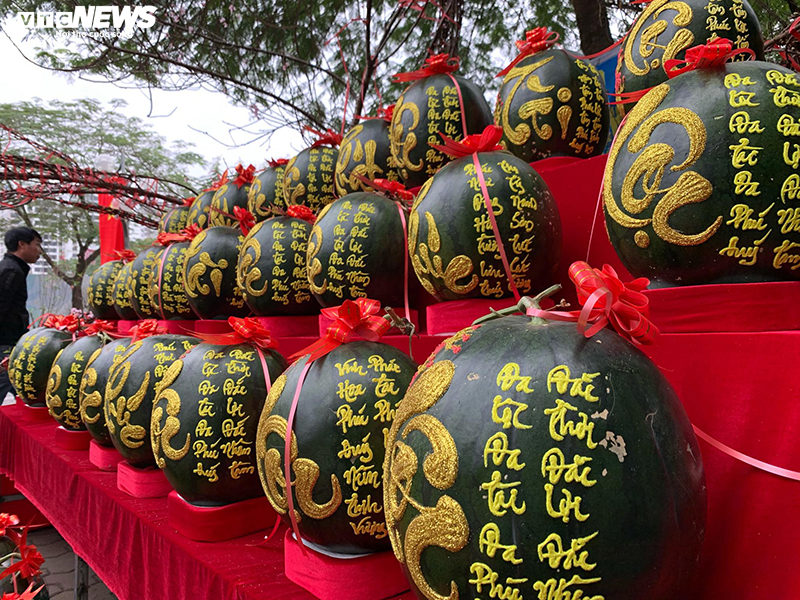 Dưa hấu thư pháp độc đáo mới xuất hiện tại thị trường Tết Hà Nội.