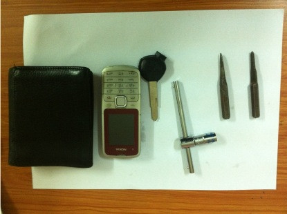 CSHS đã thu giữ trong người của Em hai cây đầu đoản và một cây đoản (dụng cụ hành nghề của những người đi trộm xe), một chiếc điện thoại di động Nokia C1.