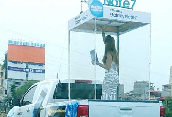 Trước đó, sáng 11/8, Siêu thị Thế giới di động số 58 đường Nguyễn Khánh Toàn (P.Quan Hoa, Q.Cầu Giấy, Hà Nội), đặt một lồng kính gắn nhãn Samsung Galaxy Note 7 có một cô gái bên trong lên xe bán tải và đi dạo phố. Hoạt động này được cho nhằm quảng cáo cho dòng điện thoại Samsung Galaxy Note 7 vừa ra mắt tại Việt Nam.