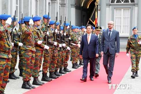 | Thủ tướng Nguyễn Tấn Dũng và Thủ tướng Vương quốc Bỉ Charles Michel duyệt đội danh dự. (Ảnh: Đức Tám/TTXVN) |