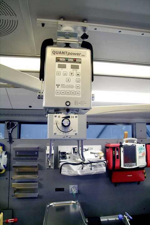 Trong số 3 phòng trên xe buýt như bệnh viện mini này, có 1 khoang có thể biến thành một phòng mổ thực sự với đầy đủ các chức năng. Bệnh viện di động này được trang bị máy điện tâm đồ (ECG), máy giám sát phản ứng sốc InSpectra, máy chụp X-quang (cỡ nhỏ nhất thế giới) và cả thiết bị siêu âm.