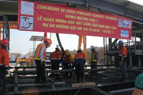 Sáng 6/4, tại bãi đúc dầm khu Deport Bình Long (Q.9, TPHCM), Ban quản lý đường sắt đô thị TPHCM và các nhà thầu đã tiến hành đúc đốt dầm cầu cạn đầu tiên của dự án đường sắt đô thịTPHCM, tuyến số 1.