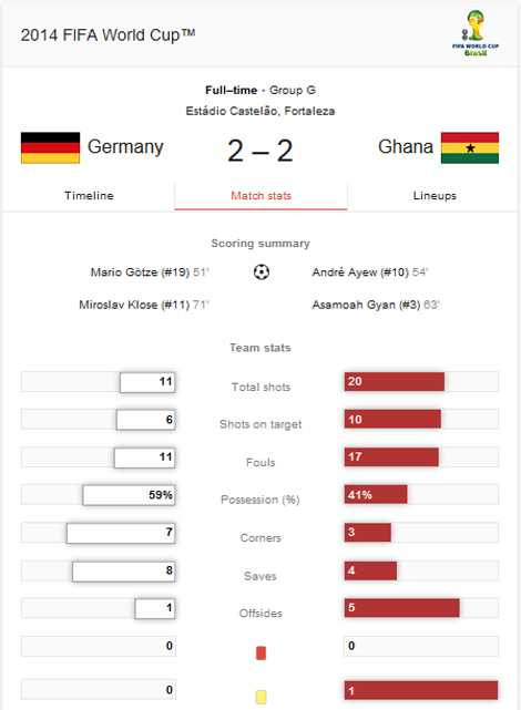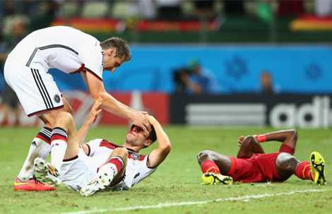 Phía bên kia chiến tuyến, Đức phải rất khó khăn mới có bàn thắng mở tỷ số của Gotze ở phút 51 nhưng rồi không bảo vệ được thành quả khi Ghana tràn lên.