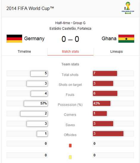 35': Những quả chọc khe đang là vũ khí lợi hại của Đức. Các cầu thủ thoát xuống và ở tư thế thuận lợi nhưng lại còn thiếu chính xác ở những tình huống cuối cùng. Trong khi đó, Ghana chơi phòng ngự số đông, bọc lót khá tốt. Họ cũng biết tấn công đầy chớp nhoáng và thực sự đã tạo ra những sóng gió trước khung thành Đức.