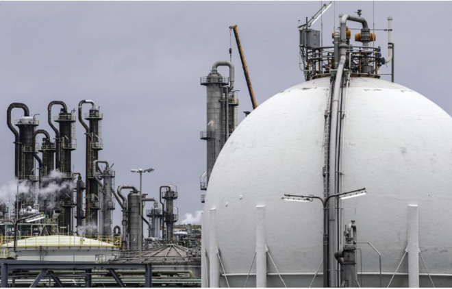 Bể chứa khí đốt tại một nhà máy hóa chất ở Oberhausen (Đức). (Ảnh: AP)