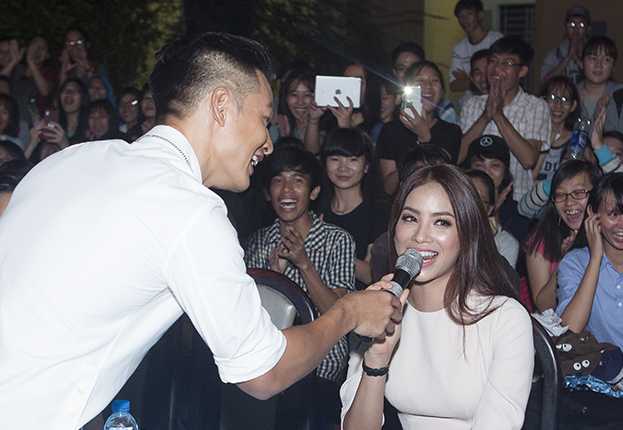 Hoa hậu Phạm Hương cũng tiếp ứng nhanh chóng khi tiếp tục những câu hát đang dang dở và sau đó cô cùng ca sĩ Đức Tuấn hòa ca cùng các bạn sinh viên.