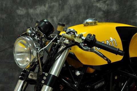 | Toàn bộ phần quây gió nguyên bản của 750 SSie đã bị Pepo vứt bỏ, thay vào đó anh đã tạo cho chiếc xe một giá gắn đèn pha bằng thép uốn "đều như máy" trước khi lắp cho xe đèn pha MASH 125. Các tay phanh/côn cũng do chính XTR Pepo chế tạo với khả năng điều chỉnh linh hoạt. |
