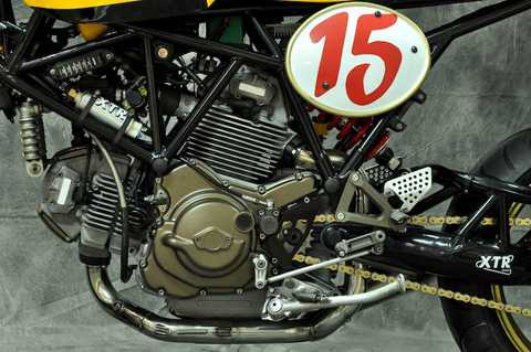 | Khối động cơ 750 cc L-Twin nguyên bản của chiếc xe cũng không được Pepo bỏ qua, khi anh đã thay bộ côn độ Frentubo, lọc gió xe đua DNA, cam hiệu năng cao, các cửa nạp xả xú-páp nới rộng và bơm xăng công suất cao. Ngay phía sau động cơ là dàn để chân CNC của SP. |