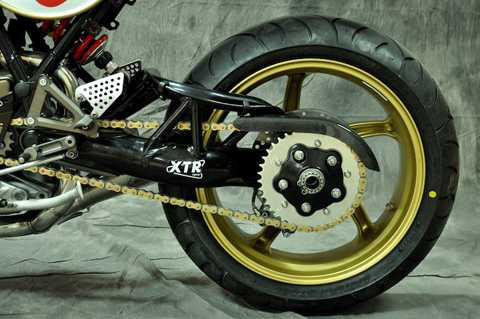 | Nằm giữa cặp phuộc USD nguyên bản của 750 SS, Pepo đã lắp cho chiếc xe mâm Marchesini 5 cánh xoắn có nguồn gốc từ Ducati Monster S2R, kèm theo heo phanh phía trước của hãng NG, dây phanh Frentubo và chắn bùn bằng sợi carbon do chính xưởng XTR của anh sản xuất. |
