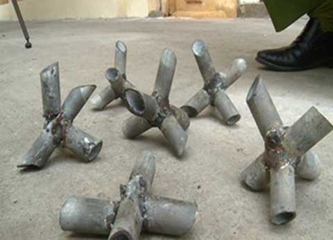 | Các bàn chông tự chế được nhóm thanh niên đặt trên đường để bẫy ô tô |
