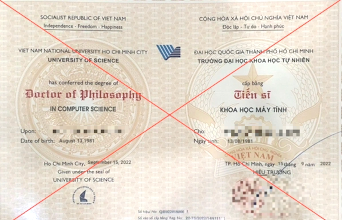 Khi nộp hồ sơ, người này cung cấp cho nhà trường bằng tiến sĩ với tên N.T.H (sinh ngày 13/8/1981), ngành khoa học máy tính, được cấp vào năm 2021 với số hiệu văn bằng QH: 22086798528xx.