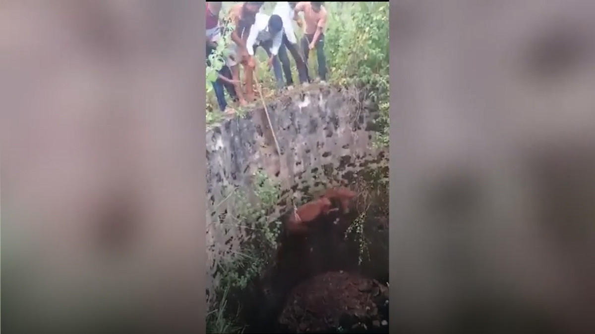Chú ngựa con bị rơi xuống một cái giếng bỏ hoang ở Ấn Độ 3 ngày mới được phát hiện, người dân dùng dây thừng để kéo nó lên.