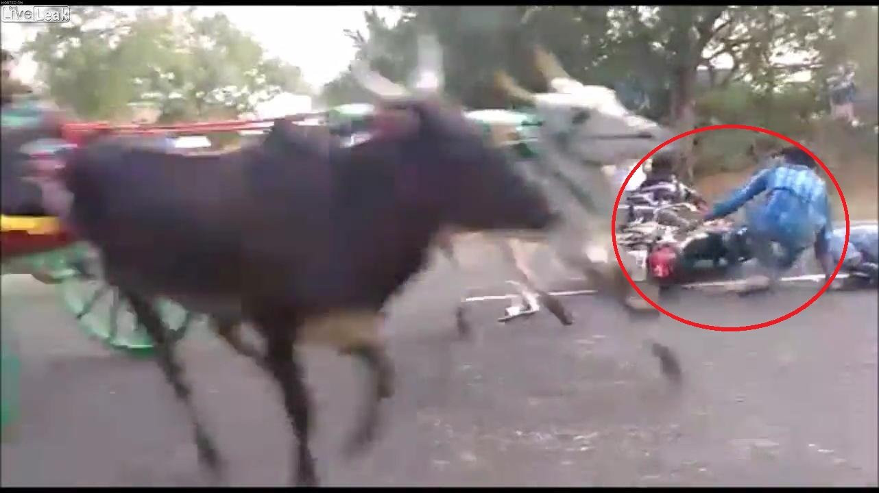Người đàn ông ôm máy quay ngồi trên xe máy dừng ở giữa đường để ghi hình cuộc đua bò tại Ấn Độ, lập tức bị đàn bò chạy qua húc ngã, giày xéo, giẫm đạp không thương tiếc.