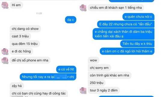 Tương tự, H.Q. (quê tỉnh Khánh Hòa) cho biết sau khi đăng tải tấm hình chụp ở biển lên mạng xã hội Facebook đã bị một người lạ nhắn tin, dụ “đi khách” với giá 3 triệu đồng. Nếu đồng ý đi theo tour du lịch 2-3 ngày thì lên đến 15 triệu đồng/lần.