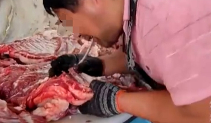 Clip ghi lại cảnh người bán thịt dùng răng lọc xương.