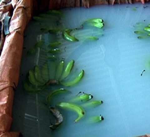 Theo xác minh của cơ quan chức năng, ông Tiến sử dụng khí đá (khí từ đất đèn) và thuốc diệt cỏ CO 2,4D để làm chuối chín đồng thời giúp cứng trái.