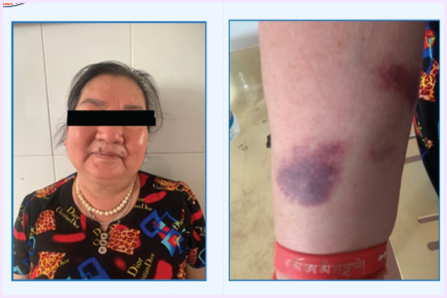 Bà Đ. được người nhà đưa đến bệnh viện trong tình trạng tỉnh, tiếp xúc chậm, đau mỏi xương khớp, yếu mỏi cơ, khó thở sau những cơn ho. Bà Đ. xuất hiện hội chứng Cushing với các dấu hiệu như béo vùng trung tâm, mặt to tròn, rậm lông vùng ria mép, da mỏng có nhiều đám xuất huyết, hội chứng nhiễm trùng rõ.