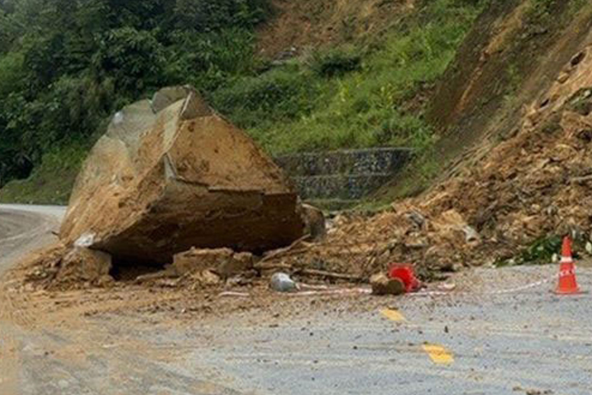 Tảng đá lớn chắn ngang Quốc lộ 4D. (Ảnh: Báo Lào Cai)