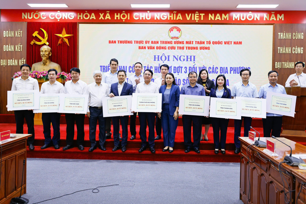 Chiều 22/11, lãnh đạo Ủy ban Trung ương MTTQ Việt Nam trao kinh phí hỗ trợ đợt 3 cho các tỉnh, thành phố bị thiệt hại do cơn bão Yagi gây ra. (Ảnh: Quang Vinh)