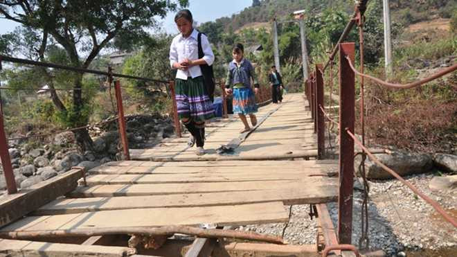 Bà Va Thị Mơ (46 tuổi, ở cùng bản) tiếp lời anh Phông: “Đến người lớn qua cầu còn không dám nhìn xuống dưới. Mấy đứa trẻ con thì không dám cho chúng đi một mình, khi nào ra trạm xá hay xuống xã phải có người lớn đi cùng”.